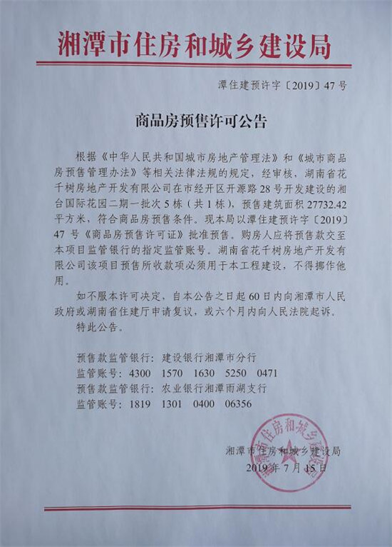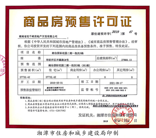 經(jīng)審核,湖南省花千樹房地產(chǎn)開發(fā)有限公司在市經(jīng)開區(qū)開源路28號開發(fā)建設(shè)的湘臺國際花園二期一批次5棟(共1棟),預(yù)售建筑面積27732.42平方米,符合商品房預(yù)售條件,F(xiàn)本局以潭住建預(yù)許字【2019】第47號《商品房預(yù)售許可證》批準預(yù)售。