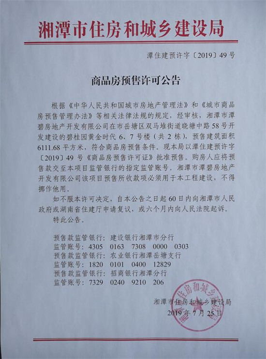 經(jīng)審核,湘潭市潭碧房地產(chǎn)開發(fā)有限公司在市岳塘區(qū)雙馬堆街道曉塘中路58號開發(fā)建設(shè)的碧桂園黃金時代6、7號樓(共2棟),預售建筑面積6111.68平方米,符合商品房預售條件。現(xiàn)本局以潭住建預許字【2019】49號《商品房預售許可證》批準預售。