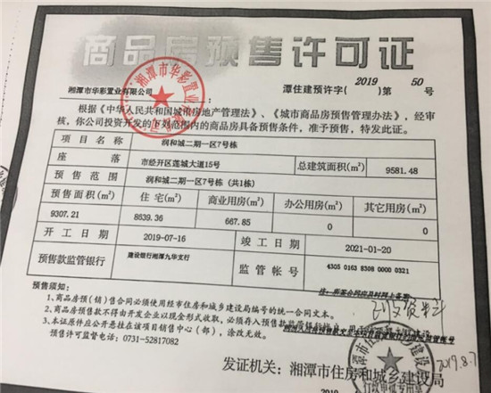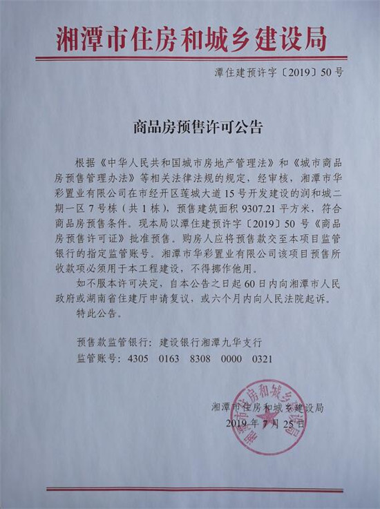 經(jīng)審核,湘潭市華彩置業(yè)有限公司在市經(jīng)開區(qū)蓮城大道15號開發(fā)建設(shè)的潤和城二期一區(qū)7號棟(共1棟),預(yù)售建筑面積9307.21平方米,符合商品房預(yù)售條件,現(xiàn)本局以潭住建預(yù)許字【2019】50號《商品房預(yù)售許可證》批準(zhǔn)預(yù)售。