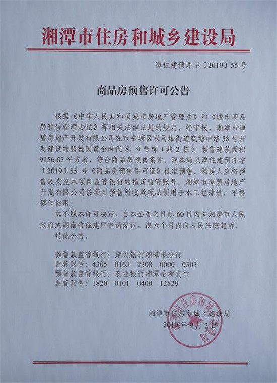 經(jīng)審核,湘潭市潭碧房地產(chǎn)開發(fā)有限公司在市岳塘區(qū)雙馬堆街道曉塘中路58號開發(fā)建設(shè)的碧桂園黃金時代8、9號棟(共2棟),預(yù)售建筑面積9156.62平方米,符合商品房預(yù)售條件,現(xiàn)本局以潭住建預(yù)許字【2019】55號《商品房預(yù)售許可證》批準預(yù)售。