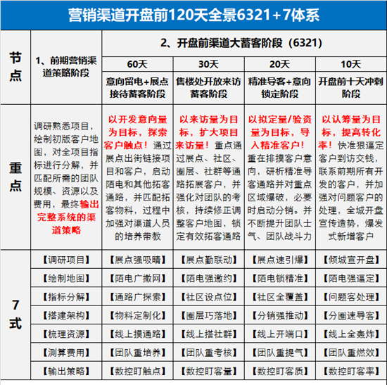 湘潭房產(chǎn)網(wǎng)5月10日訊 各公司基本都有項(xiàng)目大營銷全景體系,但有專門針對渠道的全景體系不多,今天為大家梳理了營銷渠道開盤前120天全景6321+7體系(6321是指營銷重要節(jié)點(diǎn),7是指匹配節(jié)點(diǎn)的渠道7大招式),希望對大家有所幫助。