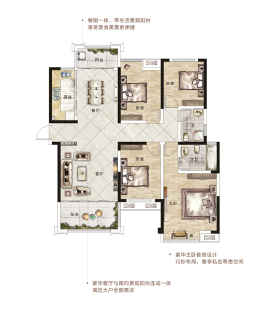 豪華客廳與南向景觀陽臺連成一體,闊綽開間,戶型方正,南北通透,既能容納下朋友聚會、親友來訪,又能接納下清風入室、美景入屋。