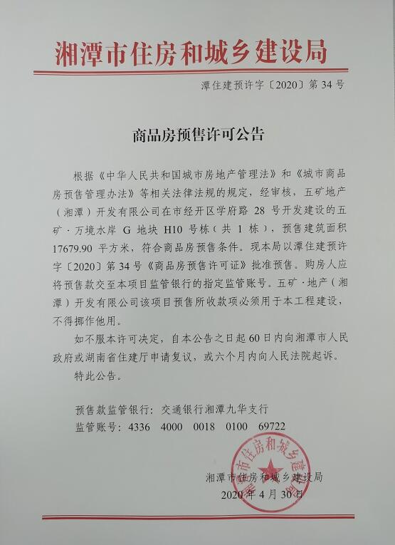 經(jīng)審核,五礦地產(chǎn)(湘潭)開發(fā)有限公司在市經(jīng)開區(qū)學(xué)府路28號(hào)開發(fā)建設(shè)的五礦·萬境水岸G地塊H10號(hào)棟(共1棟),預(yù)售建筑面積17679.90平方米,符合商品預(yù)售條件,現(xiàn)本局以潭住建預(yù)許字【2020】第34號(hào)《商品房預(yù)售許可證》批準(zhǔn)預(yù)售。