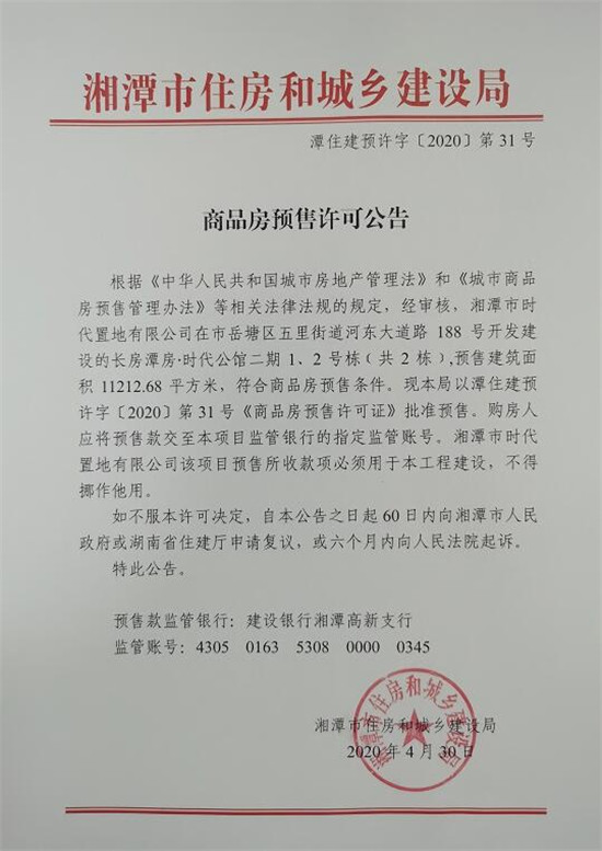 經(jīng)審核,湘潭市時代置地有限公司在市岳塘區(qū)五里街道河?xùn)|大道路188號開發(fā)建設(shè)的長房潭房·時代公館二期1、2號棟(共2棟),預(yù)售建筑面積11212.68平方米,符合商品預(yù)售條件,現(xiàn)本局以潭住建預(yù)許字【2020】第31號《商品房預(yù)售許可證》批準(zhǔn)預(yù)售。