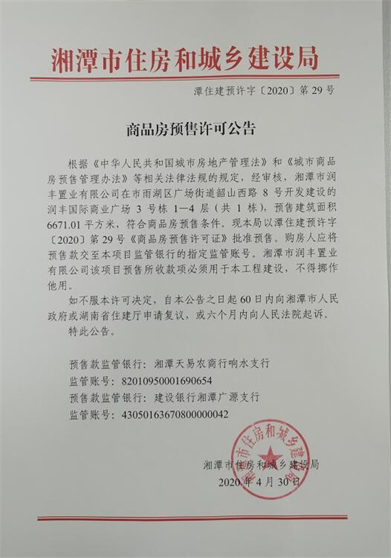 經(jīng)審核,湘潭市潤豐置業(yè)有限公司在市雨湖區(qū)廣場街道韶山西路8號開發(fā)建設(shè)的潤豐國際商業(yè)廣場3號棟1-4層(共1棟),預(yù)售建筑面積6671.01平方米,符合商品房預(yù)售條件,現(xiàn)本局以潭住建預(yù)許字【2020】29號《商品房預(yù)售許可證》批準(zhǔn)預(yù)售。
