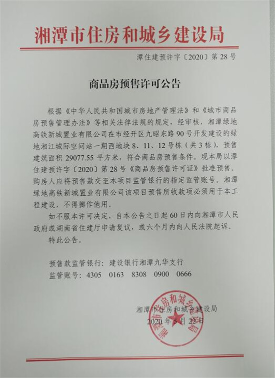 經(jīng)審核,湘潭綠地高鐵新城置業(yè)有限公司在市經(jīng)開區(qū)九昭東路90號(hào)開發(fā)建設(shè)的綠地湘江城際空間站一期西地塊8、11、12號(hào)棟(共3棟),預(yù)售建筑面積29077.55平方米,符合商品房預(yù)售條件,現(xiàn)本局以潭住建預(yù)許字【2020】28號(hào)《商品房預(yù)售許可證》批準(zhǔn)預(yù)售。