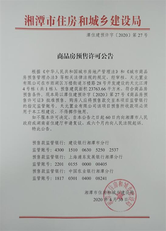 經(jīng)審核,天元置業(yè)有限公司在市雨湖區(qū)萬樓路28號開發(fā)建設(shè)的天元江灣4號棟(共1棟),預(yù)售建筑面積23763.66平方米,符合商品房預(yù)售條件,現(xiàn)本局以潭住建預(yù)許字【2020】27號《商品房預(yù)售許可證》批準(zhǔn)預(yù)售。
