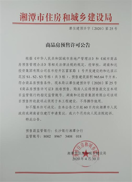 經(jīng)審核,湖南和達(dá)投資集團(tuán)有限公司在市經(jīng)開(kāi)區(qū)富家路1號(hào)開(kāi)發(fā)建設(shè)的和達(dá)濱江花園S1、S2、S3號(hào)棟(共3棟),預(yù)售建筑面積965.64平方米,符合商品房預(yù)售條件,現(xiàn)本局以潭住建預(yù)許字【2020】25號(hào)《商品房預(yù)售許可證》批準(zhǔn)預(yù)售。