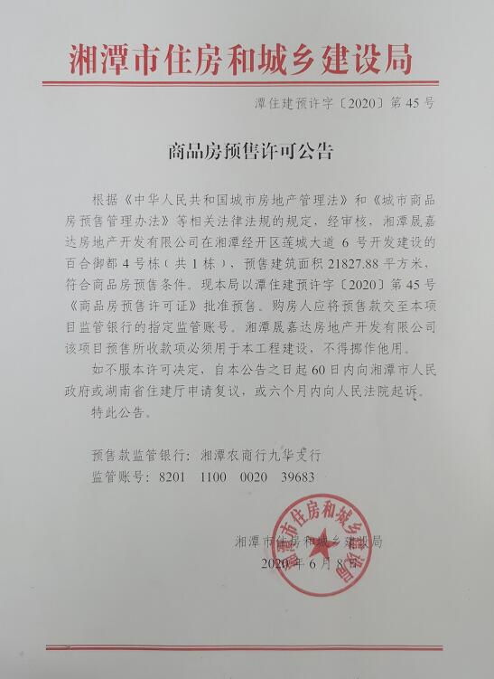 經(jīng)審核,湘潭晟嘉達(dá)房地產(chǎn)開(kāi)發(fā)有限公司在湘潭經(jīng)開(kāi)區(qū)蓮城大道6號(hào)開(kāi)發(fā)建設(shè)的百合御都4號(hào)棟(共1棟),預(yù)售建筑面積21827.88平方米,符合商品房預(yù)售條件,現(xiàn)本局以潭住建預(yù)許字【2020】45號(hào)《商品房預(yù)售許可證》批準(zhǔn)預(yù)售。 |