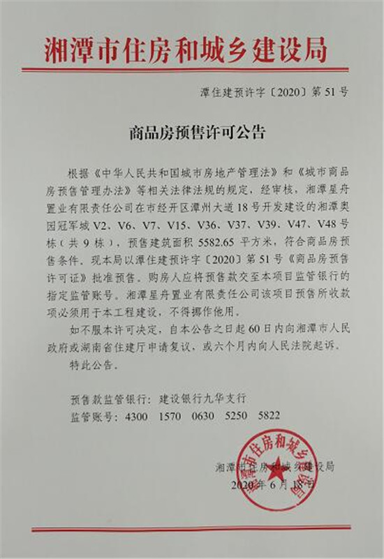 關于湘潭奧園冠軍城V2、V6、V7、V15、V36、V37、V39、V47、V48號棟(共9棟)預售許可公告