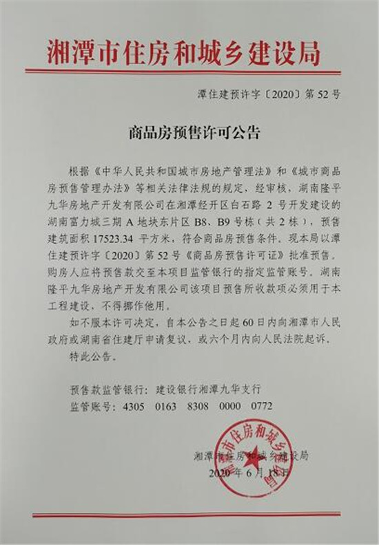 關(guān)于湖南富力城三期A地塊東片區(qū)B8、B9號棟(共2棟)預(yù)售許可公告