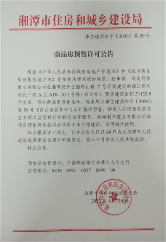 關于湘江保利時代一期A區(qū)A10、A11號棟(共2棟)預售許可公告