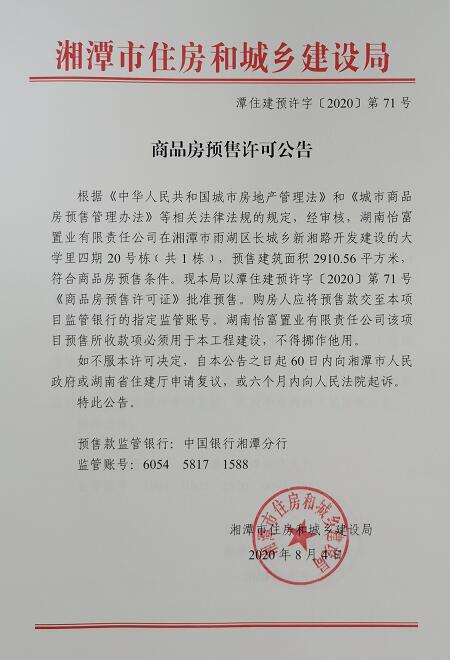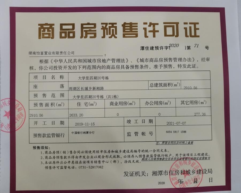 關(guān)于大學(xué)里四期20號(hào)棟(共1棟)預(yù)售許可公告
