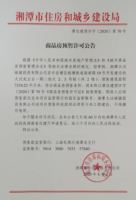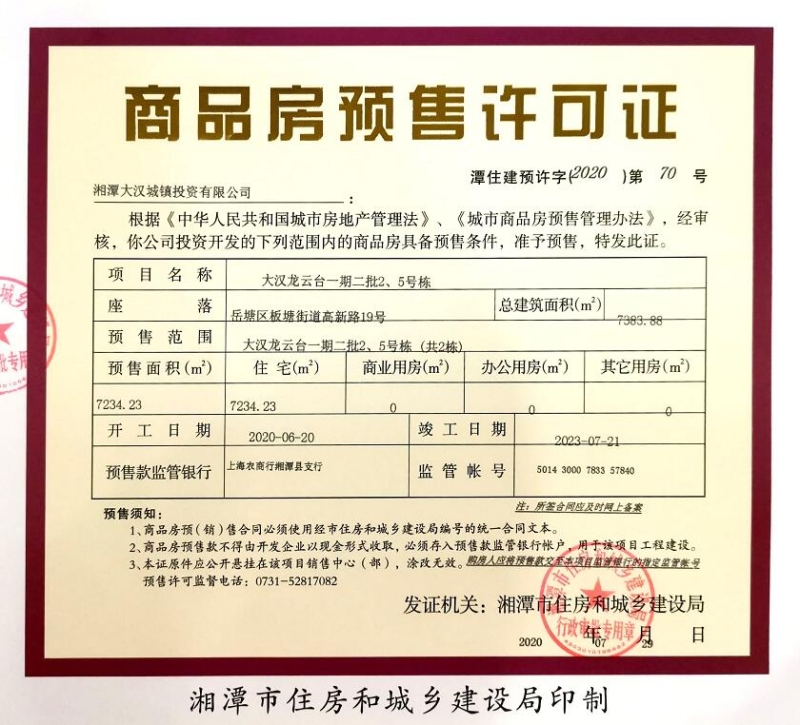 關(guān)于大漢龍?jiān)婆_(tái)一期二批次2、5號(hào)棟(共2棟)預(yù)售許可公告