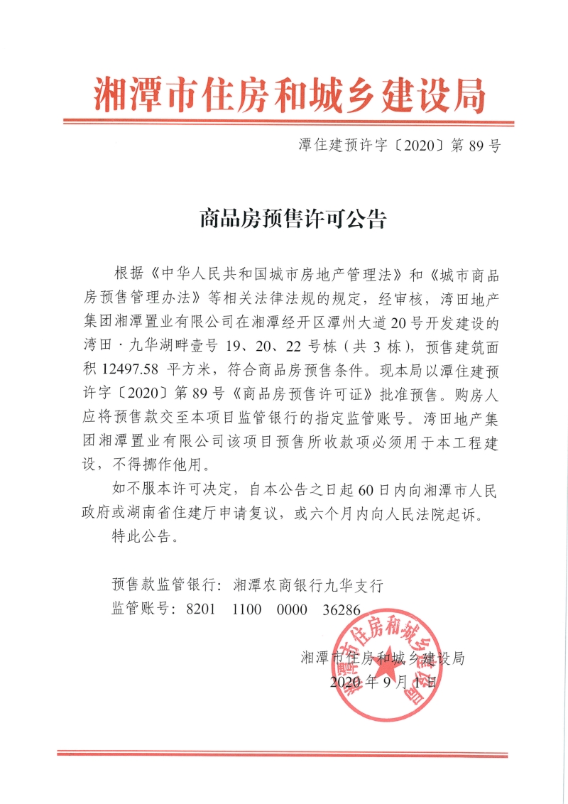 關于灣田·九華湖畔壹號19、20、22號棟(共3棟)預售許可公告
