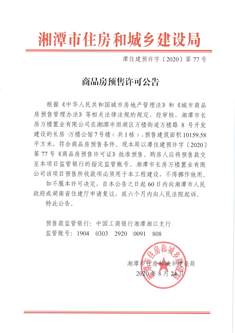 關(guān)于長(zhǎng)房·萬(wàn)樓公館7號(hào)棟(共1棟)預(yù)售許可公告