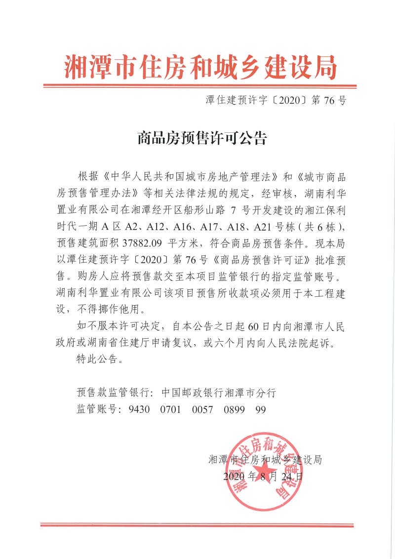 關于湘江保利時代一期A區(qū)A2、A12、A16、A17、A18、A21號棟(共6棟)預售許可公告