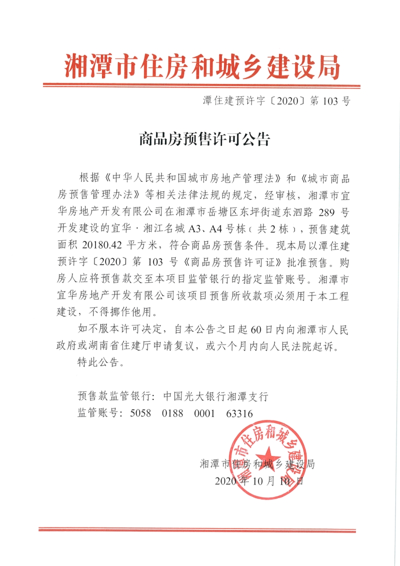 關于宜華·湘江名城A3、A4號棟(共2棟)預售許可公告