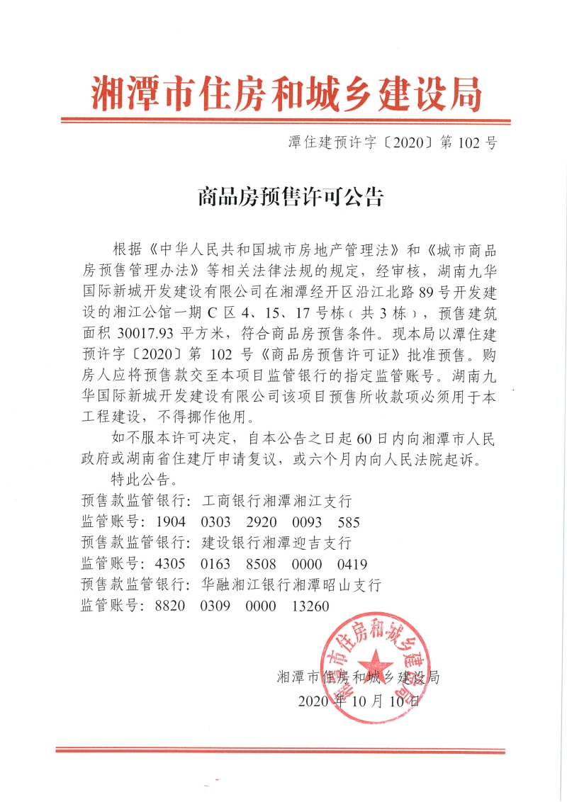 關(guān)于湘江公館一期C區(qū)4、15、17號(hào)棟(共3棟)預(yù)售許可公告