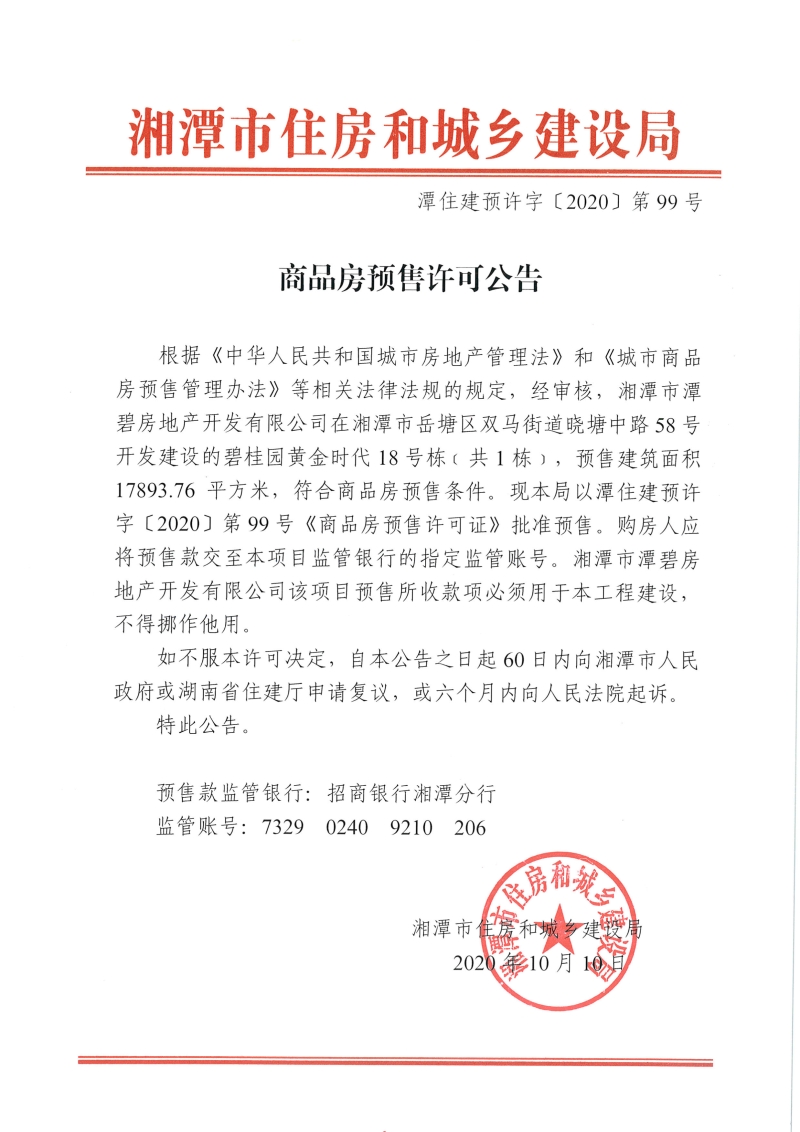 關(guān)于碧桂園黃金時代18號棟(共1棟)預(yù)售許可公告