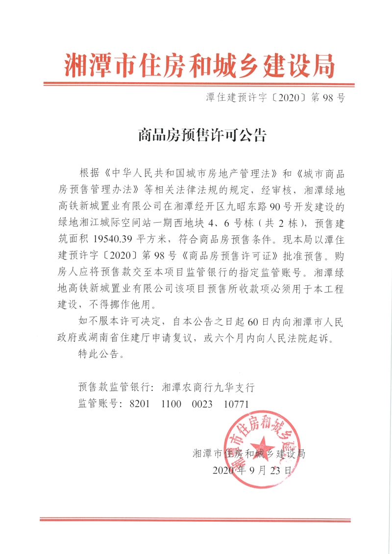 關(guān)于綠地湘江城際空間站一期西地塊4、6號(hào)棟(共2棟)預(yù)售許可公告