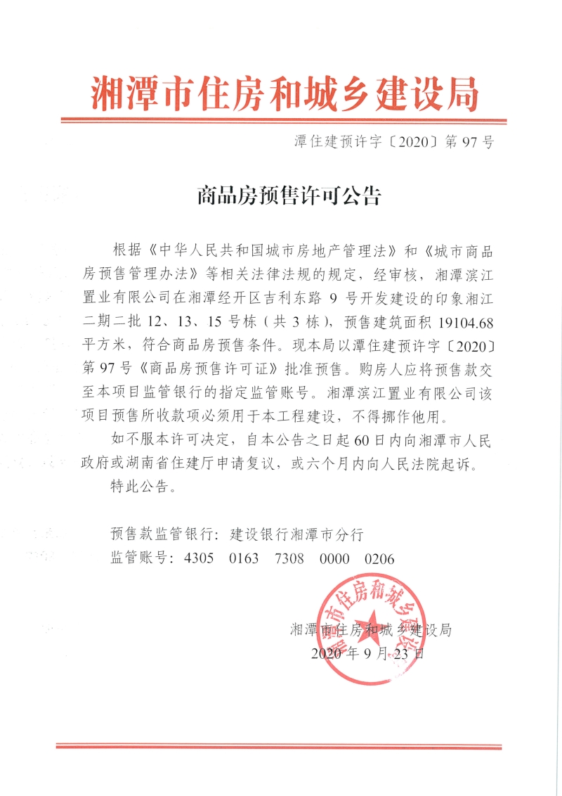 關(guān)于印象湘江二期二批12、13、15號(hào)棟(共3棟)預(yù)售許可公告