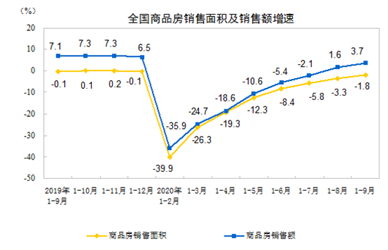 1—9月份,商品房銷售面積117073萬(wàn)平方米,同比下降1.8%,降幅比1—8月份收窄1.5個(gè)百分點(diǎn)。其中,住宅銷售面積下降1.0%,辦公樓銷售面積下降16.5%,商業(yè)營(yíng)業(yè)用房銷售面積下降15.3%。商品房銷售額115647億元,增長(zhǎng)3.7%,增速提高2.1個(gè)百分點(diǎn)。其中,住宅銷售額增長(zhǎng)6.2%,辦公樓銷售額下降15.7%,商業(yè)營(yíng)業(yè)用房銷售額下降17.1%。