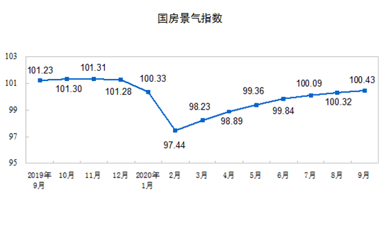 9月份,房地產(chǎn)開發(fā)景氣指數(shù)(簡(jiǎn)稱“國(guó)房景氣指數(shù)”)為100.43,比8月份提高0.11點(diǎn)。