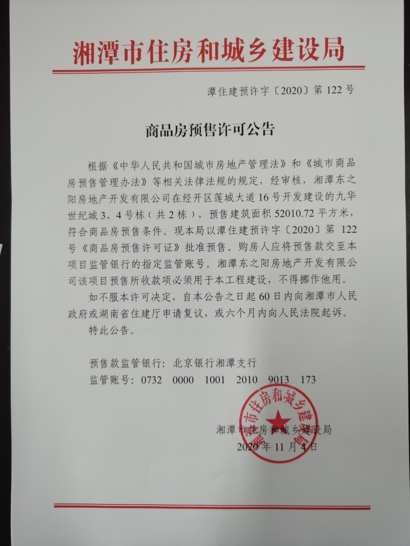 關(guān)于九華世紀城3、4號棟(共2棟)預(yù)售許可公告