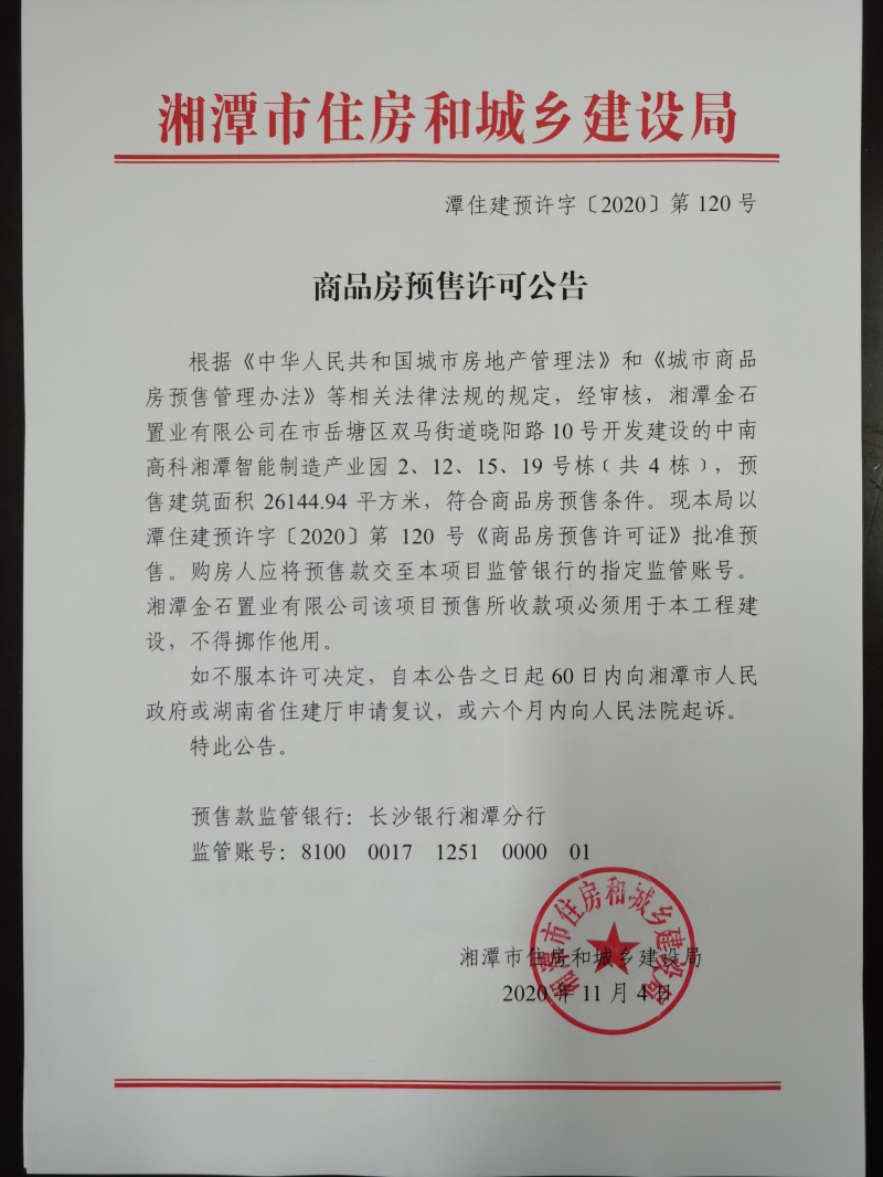 關(guān)于中南高科湘潭智能制造產(chǎn)業(yè)園 2、12、15、19號(hào)棟(共4棟)預(yù)售許可公告