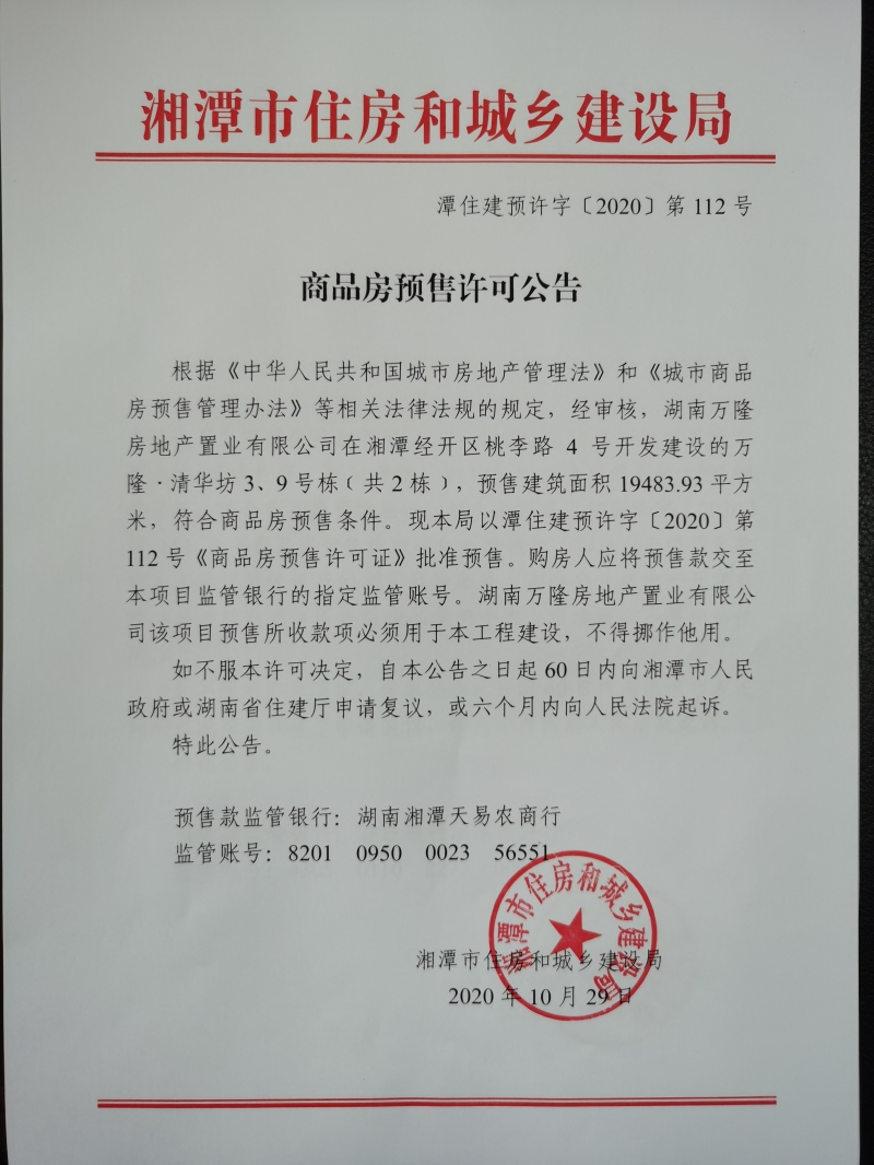 關(guān)于萬(wàn)隆·清華坊3、9號(hào)棟(共2棟)預(yù)售許可公告