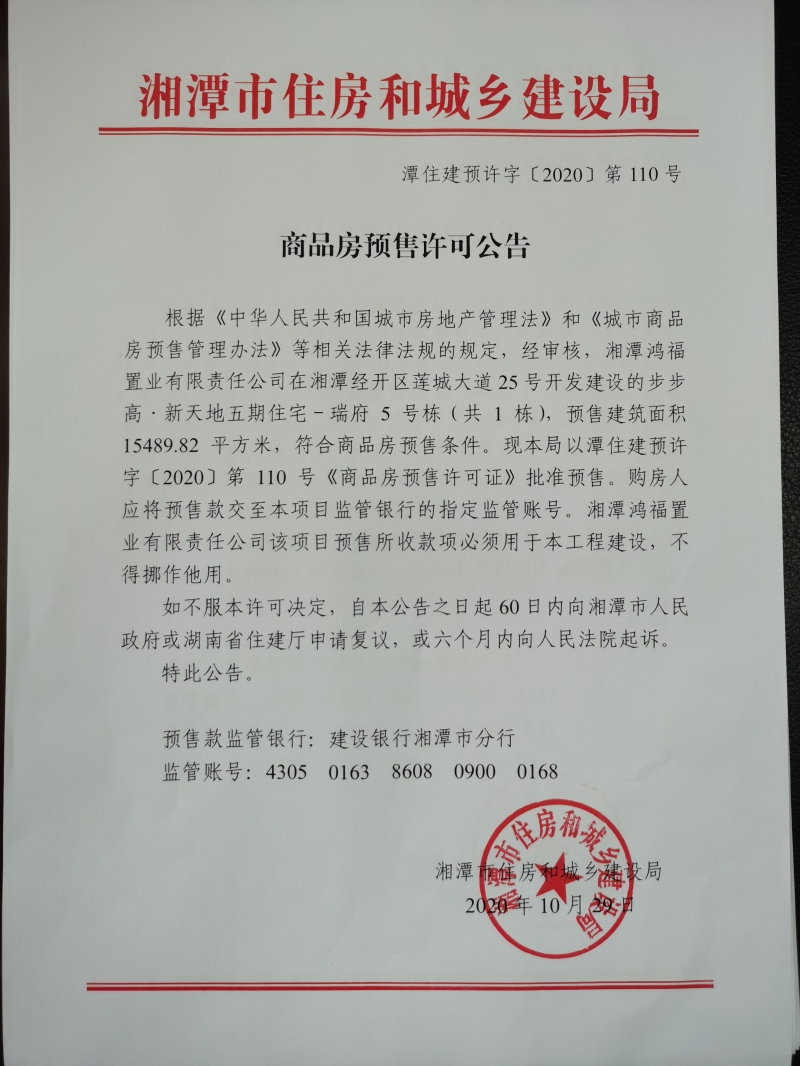 關(guān)于步步高·新天地五期住宅—瑞府5號(hào)棟(共1棟)預(yù)售許可公告