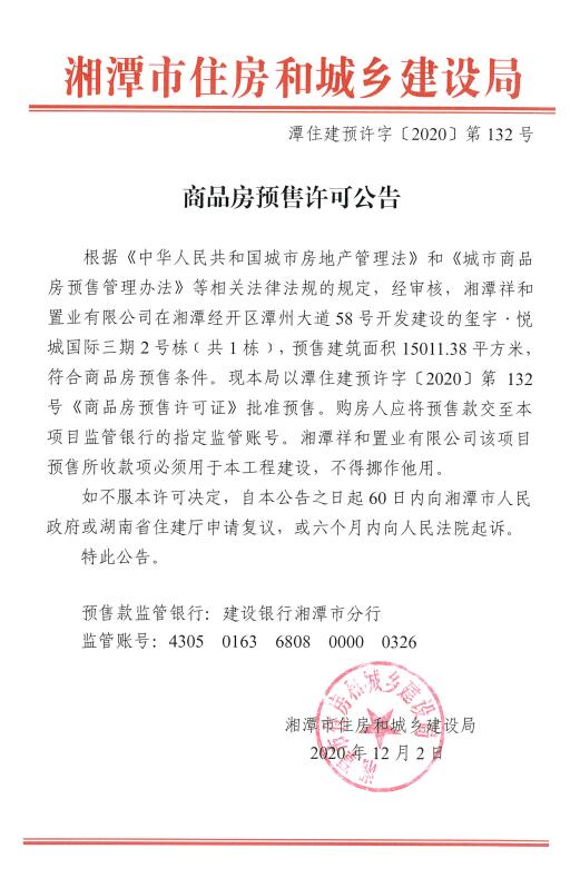 關(guān)于璽宇·悅城國際三期2號棟(共1棟)預(yù)售許可公告