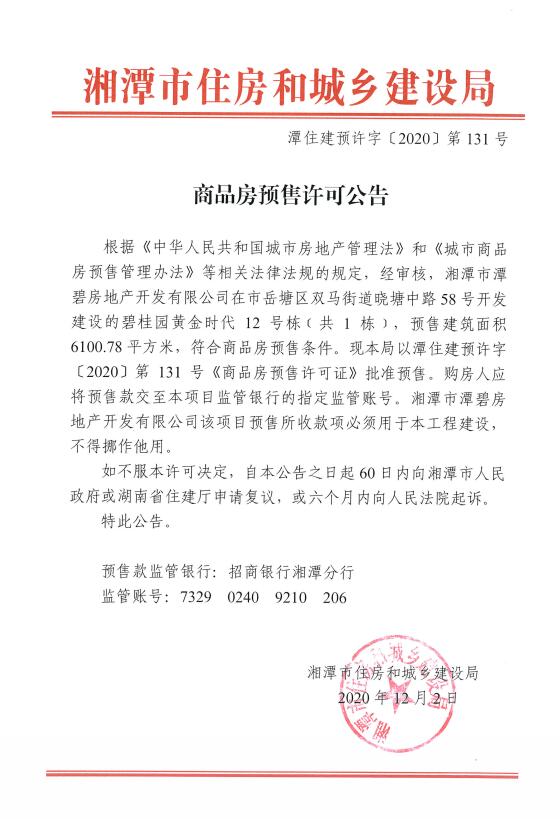 關(guān)于碧桂園黃金時(shí)代12號(hào)棟(共1棟)預(yù)售許可公告