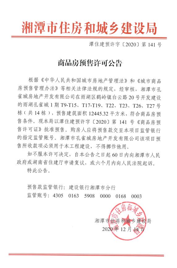 關(guān)于雨湖孔雀城1期T9-T15、T17-T19、T22、T23、T26、T27號(hào)棟(共14棟)預(yù)售許