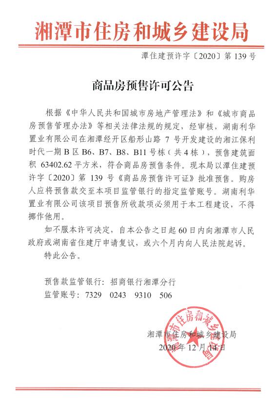 關(guān)于湘江保利時(shí)代一期B區(qū)B6、B7、B8、B11號(hào)棟(共4棟)預(yù)售許可公告