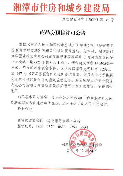 關(guān)于雅士林欣城二期G25號(hào)棟(共1棟)預(yù)售許可公告