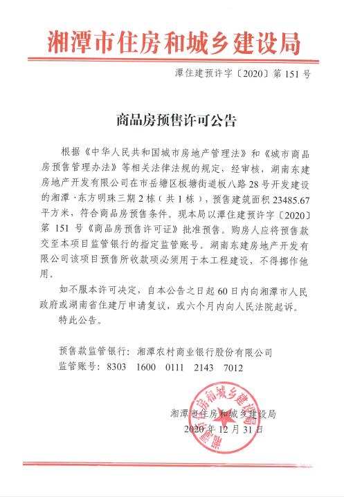 關于湘潭·東方明珠三期2棟(共1棟)預售許可公告