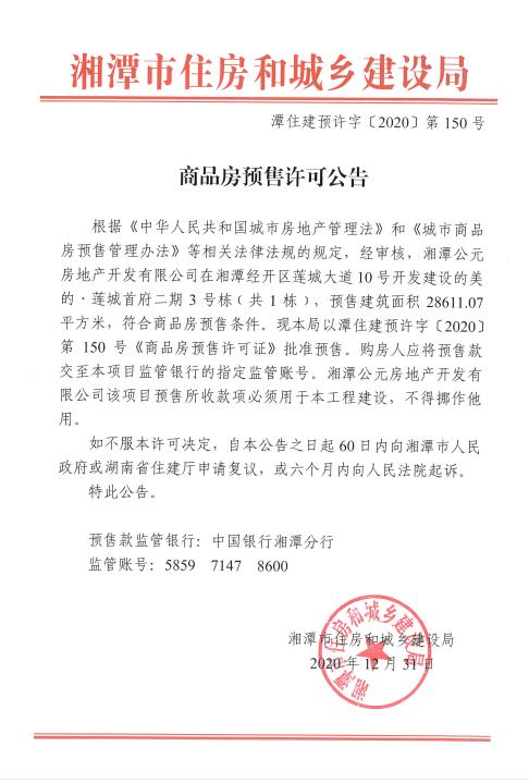 關(guān)于美的·蓮城首府二期3號(hào)棟(共1棟)預(yù)售許可公告
