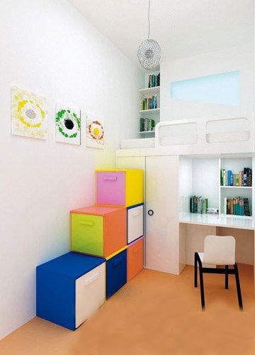 對于面積不大的兒童房,想要盛放孩子的衣物,又要給孩子一個專屬的學習環(huán)境,就可以考慮向上發(fā)展。同樣的面積,把小床架高后,下面就可以放小衣柜和書桌。樓梯可以采用積木式的方塊儲物盒,能收納小朋友的玩具,同時也可以隨意移動,給孩子帶來更多樂趣。