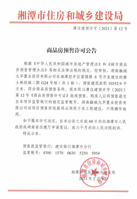 關(guān)于雅士林欣城二期G24號棟(共1棟)預(yù)售許可公告