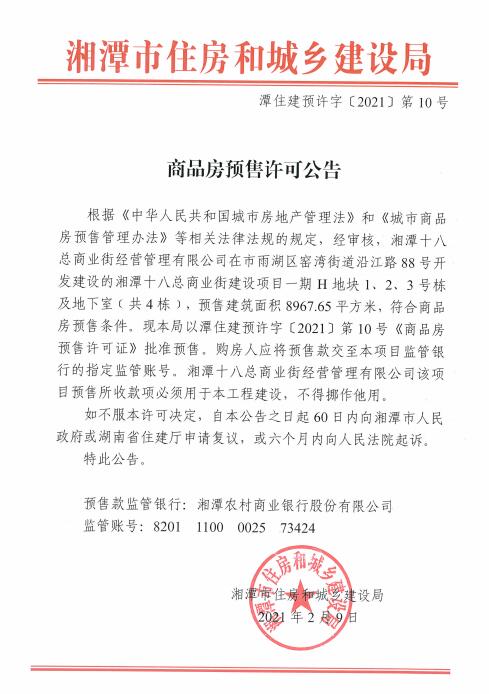 關(guān)于湘潭十八總商業(yè)街建設(shè)項(xiàng)目一期H地塊1、2、3號(hào)棟及地下室(共4棟)預(yù)售許可公告