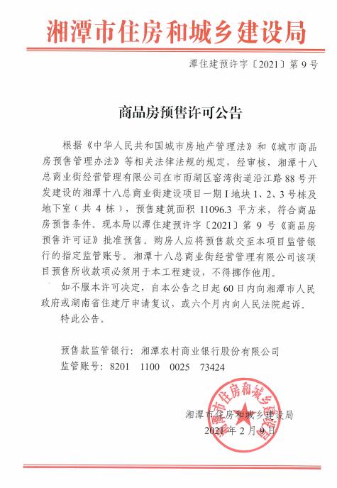 關(guān)于湘潭十八總商業(yè)街建設項目一期I地塊1、2、3號棟及地下室(共4棟)預售許可公告