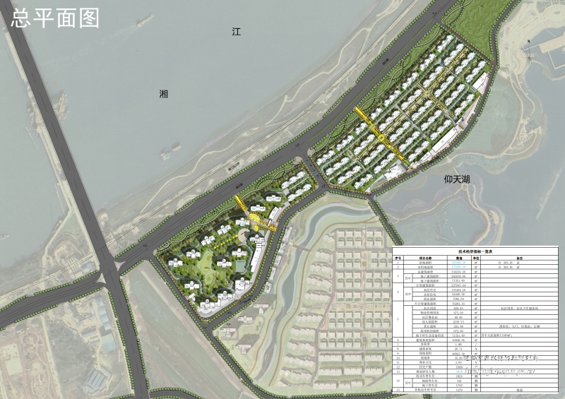 項目總用地面積為137206.30㎡,總建筑面積334230.20㎡,包含計容建筑面積257947.04㎡,不計容建筑面積76283.16㎡,綜合容積率1.88、建筑密度26.71%,包含高層住宅14棟,建筑面積155464.26㎡,多層住宅31棟(91個單元),建筑面積94500.09㎡,商業(yè)配套7982.69㎡,物業(yè)管理用房675㎡,社區(qū)用房829.83㎡,幼兒園2230.75㎡,綠地率35%。結(jié)合昭山城市設(shè)計要求,高層與多層相對獨立布置,分區(qū)明確,高層相對集中布置,沿江、沿湖遮擋相對較少,地塊內(nèi)相對平均布置四條視線通廊,空間變換有韻律感。