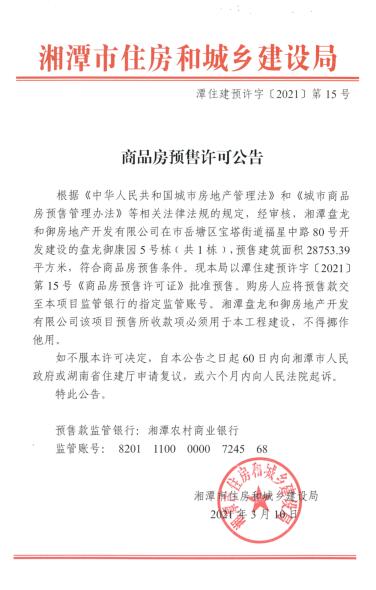 關(guān)于盤龍御康園5號(hào)棟(共1棟)預(yù)售許可公告