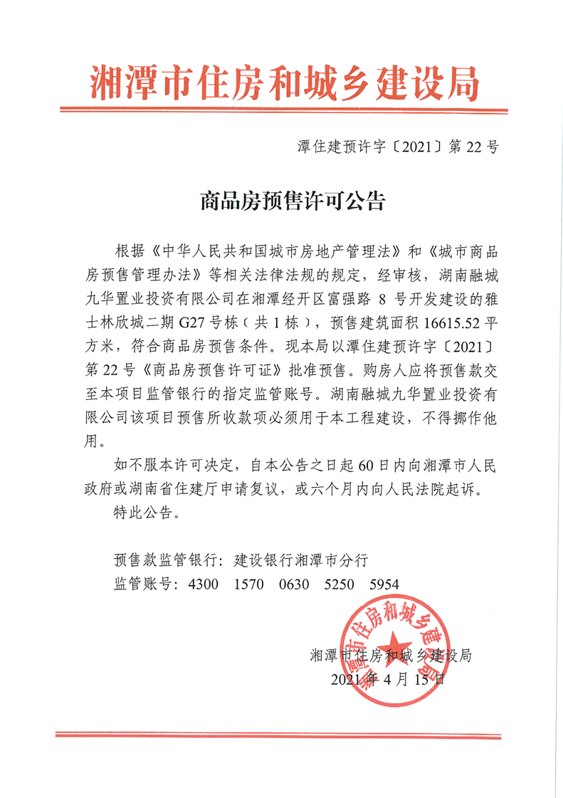 關(guān)于雅士林欣城二期G27號棟(共1棟)預(yù)售許可公告