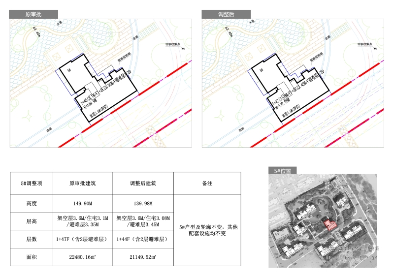 1、5#棟建筑層數(shù)由原48層調(diào)整為45層(含一層架空層和二層避難層);建筑高度(建筑正負零至屋面高度)由原149.8米,調(diào)整為139.86米。