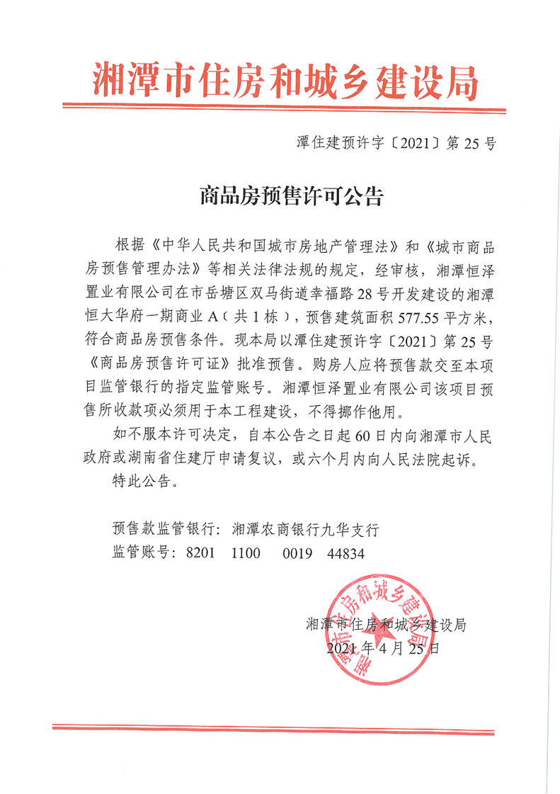 關(guān)于湘潭恒大華府一期商業(yè)A(共1棟)預(yù)售許可公告