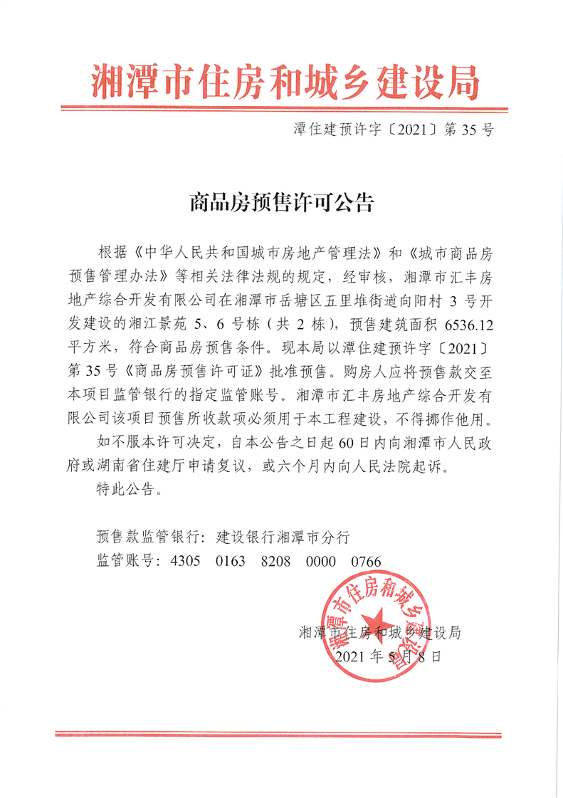 關(guān)于湘江景苑5、6號棟(共2棟)預(yù)售許可公告