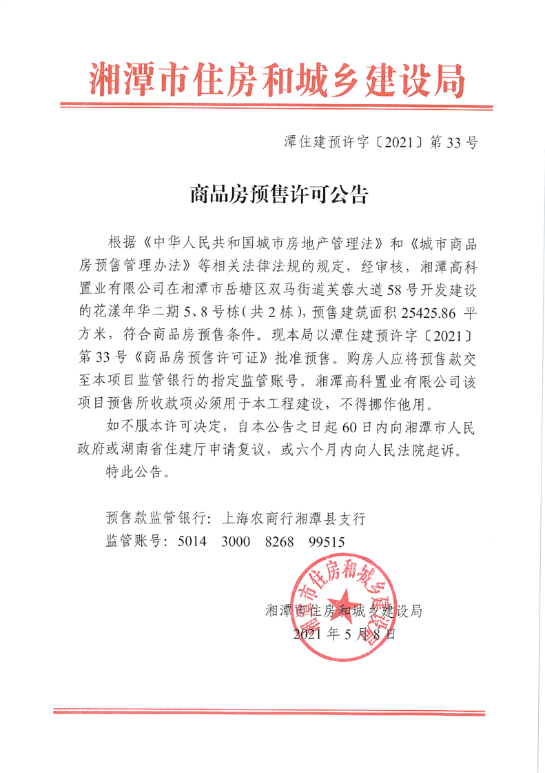 關(guān)于花漾年華二期5、8號(hào)棟(共2棟)預(yù)售許可公告